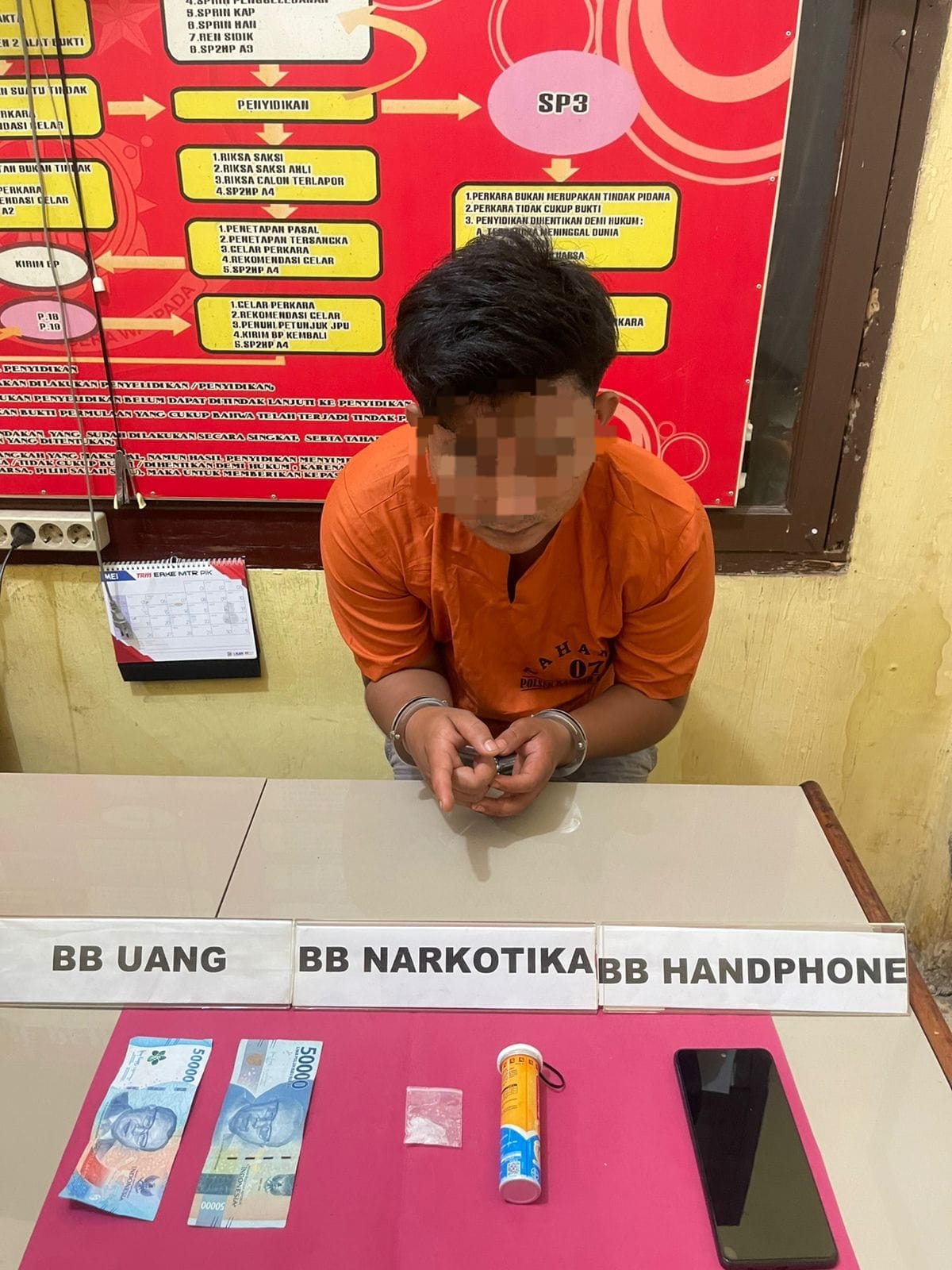 “Dari hasil penggeledahan yang dilakukan dengan disaksikan oleh Ketua Dusun setempat, tim menemukan satu paket Narkotika jenis sabu yang dibungkus dengan plastik bening di dalam botol merk REDOXON warna Kuning, sebuah handphone merk OPPO A3x warna Ungu dan uang sejumlah Rp. 100.000,-,” jelas Iptu Irwan.