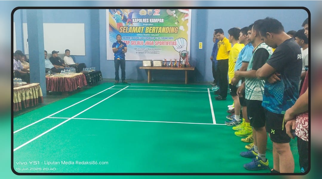 Kapolres Kampar AKBP Mihardi Mirwan melalui Kapolsek Tapung Kompol David Harisman S.T dalam sambutannya menyampaikan apresiasi kepada para pihak yang telah berpartisipasi dan memberikan dukungan atas terselenggaranya turnamen Bulutangkis Piala Kapolsek Tapung CUP l 2025, dalam rangka memeriahkan HUT Bhayangkara ke 79, yang dimulai sejak 15 Juni 2025,” ungkapnya